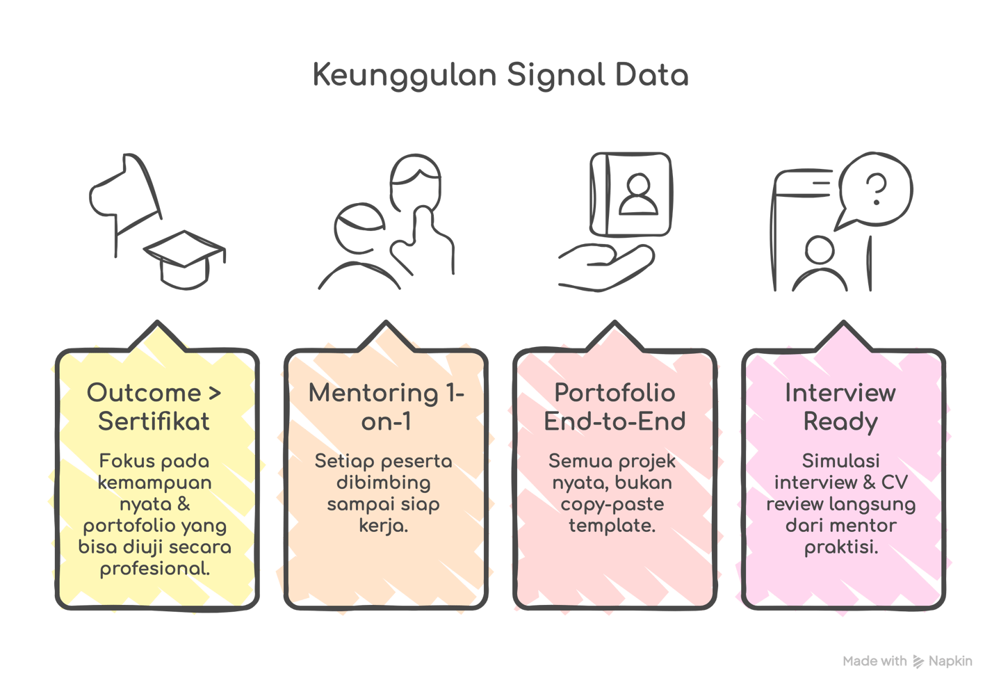 Bagi yang ingin mempelajari skill spesifik dalam waktu singkat, Mini Bootcamp kami menawarkan program seperti Excel Mastery dan Tools Data Science - Analytics (Python, SQL, BI Tools).
