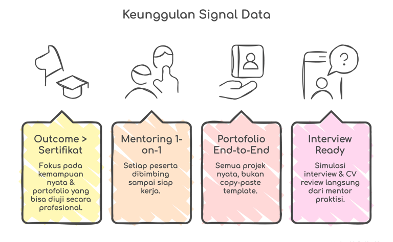 Mentoring 1‑on‑1, portofolio end-to-end, dan kesiapan interview. Untuk siapa pun yang serius mau jadi data analyst yang paham konteks bisnis & decision-making.